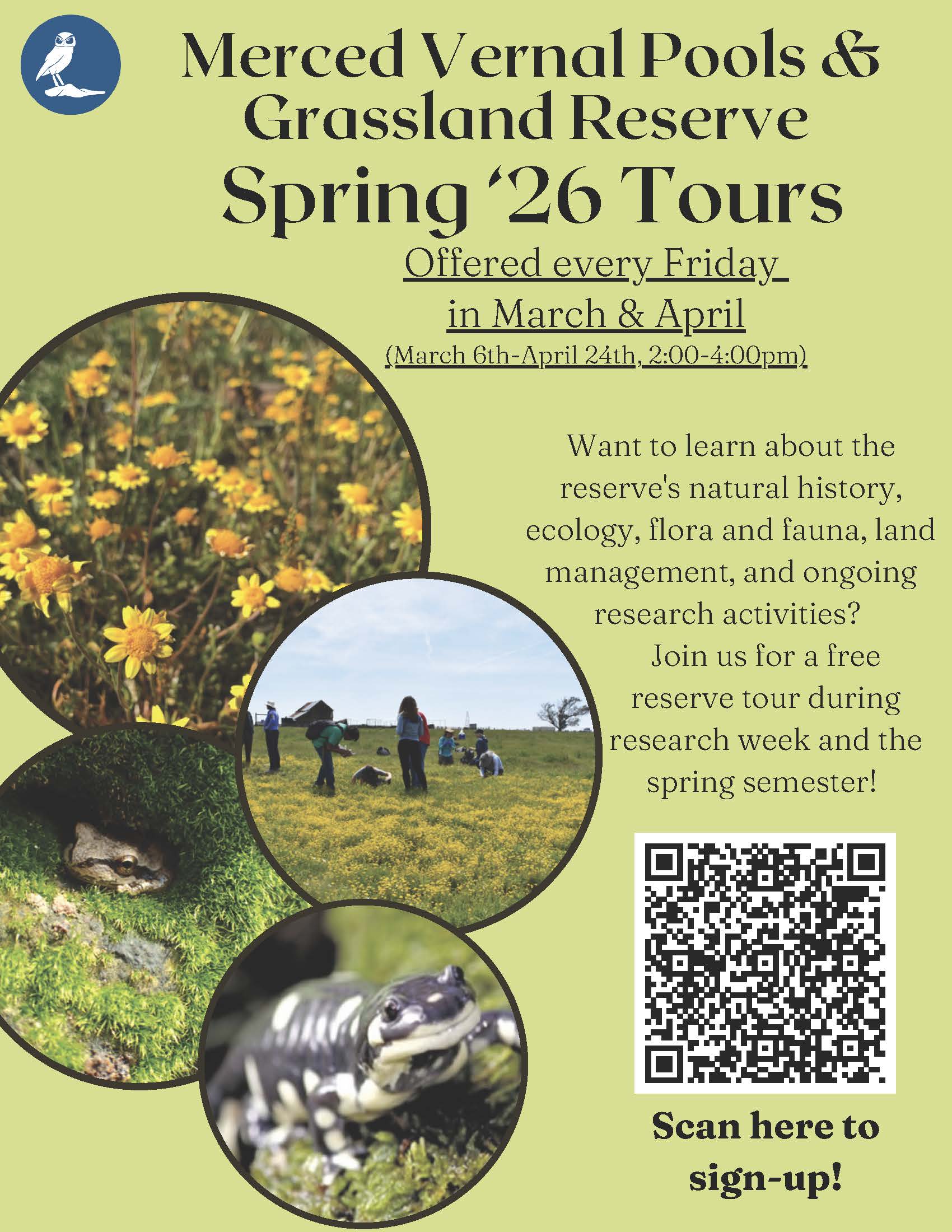 Join reserve student naturalists on a spring tour of the Merced Vernal Pools and Grassland Reserve (MVPGR)! Tours are offered every Friday afternoon from 2-4pm in March and April. On these tours, you will learn more about the reserve's natural history, the flora and fauna that call the reserve home, ecology, ongoing research activities, and so much more, including plans for the upcoming Field Education Center! The 6,500-acre reserve is a unique natural landscape to discover. With vernal pool flowers beginning to bloom and animals of all types beginning to roam the land in spring, there is plenty to see and learn about. Once registered, more information will be emailed to you regarding meet-up location and parking, as well as what items you should bring with you. The tours are free and are open to UC-attendees and non-UC-attendees. We hope to see you during a tour and can't wait for you to learn more about our beautiful natural reserve. You can register for a tour today using this link.
